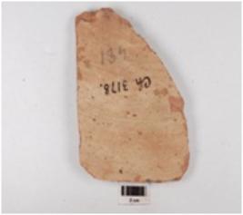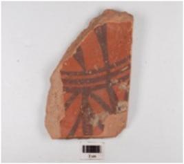 | Description / विवरण | Fragmentry dish of redware painted in black with leaf motifs and horizontal bands, of medium fabric showing an oxidized core and treated with red slip internally. |