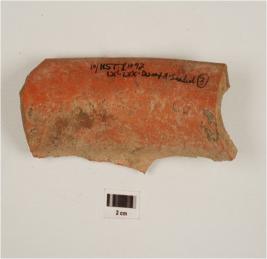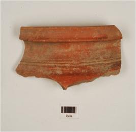 | Description / विवरण | A fragment of jar of red ware, with splayed out rim, concave neck, decorated with incised lines on the shoulder of medium fabric and treated with red slip. |