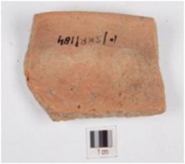 | Description / विवरण | Fragment of bowl of dull red ware, treated with red slip on both sides, featureless rim and convex profile. |
