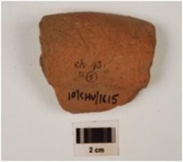 | Description / विवरण | Pot sherd of a vessel of red ware with broken rim, concave neck, medium fabric and well baked. |