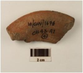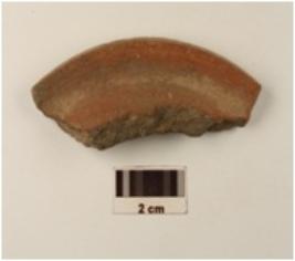 | Description / विवरण | A fragment of vase of red ware, obliquelly splayed out rim, medium fabric, showing an oxidized core and treated with red slip. |
