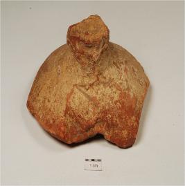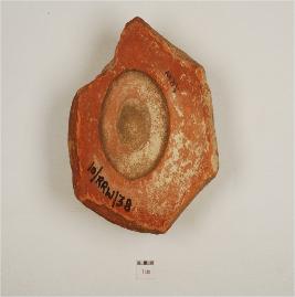 | Description / विवरण | Base fragment of lid of red ware, treated with red slip on the both surface, central button shaped knob at the top and tapering profile. |
