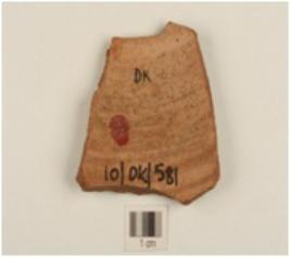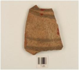 | Description / विवरण | Fragment of red ware, vase treated with buff slip on the exterior and painted with four horizontal lines in black pigment. |