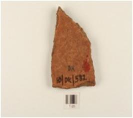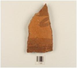 | Description / विवरण | Fragment of red ware, vase treated with red slip on both the surface and painted with three horizontal bands and an indeterminate pattern in chocolate pigment on the exterior. |