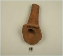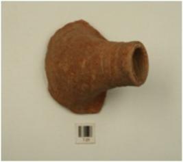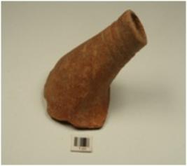 | Description / विवरण | A spout of red ware cylindrical in shape having incised band decoration on profile, treated with red slip, well baked and medium fabric. |