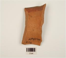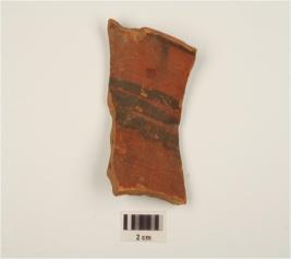 | Description / विवरण | A fragment of vase of red ware has flaring rim with concave neck painted with horizontal line in black pigment on exterior and treated with red slip on exterior. |