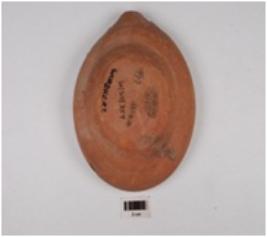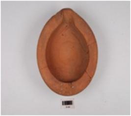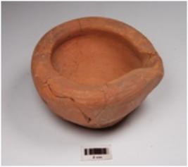 | Description / विवरण | A beaked lamp of red ware, treated with red slip on the outer surface, flat top rim, tapering profile and disc base. |