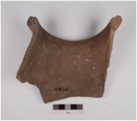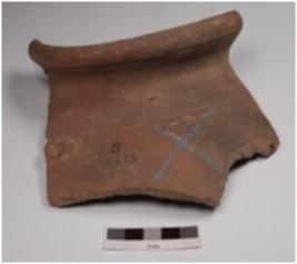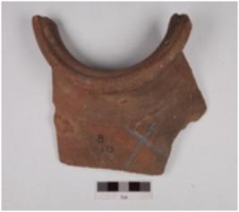 | Description / विवरण | Fragment of a jar of dull red ware, treated with slip, flaring thickened rim, concave neck and spreading profile. |