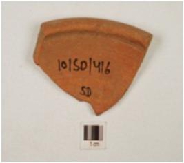 | Description / विवरण | Fragment of a bowl of red ware with nail headed rim, medium fabric and treated with red slip. |