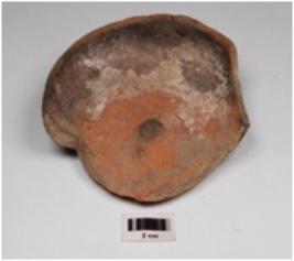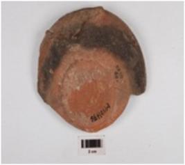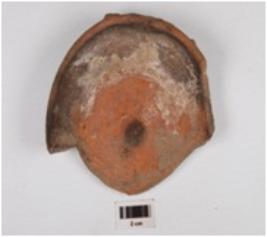 | Description / विवरण | A fragment of bowl of red ware, has incurved rim, convex profile, disc base a knob in the centre. |