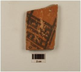 | Description / विवरण | A potsherd of red ware,painted horizontal lines and vertical lines with dots in between in black pigment on the exterior and treated with red slip. |