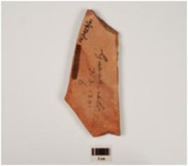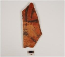 | Description / विवरण | Fragment of red ware vessel,treated with red slip on the exterior and painted with vertical and oblique bands in black pigment. |