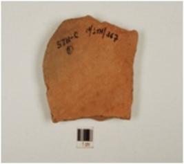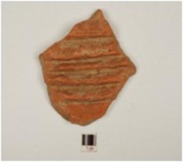 | Description / विवरण | A fragment of pot of red ware, with multigrooves on the exterior, of medium fabric and treated with red slip. |