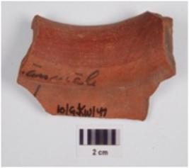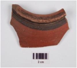 | Description / विवरण | A fragment of a vase of red ware treated with red slip, painted with black pigment has outcurved rim and globular profile. |