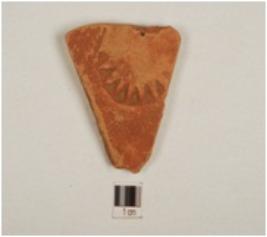 | Description / विवरण | Fragment of a red ware,treated with red slip on exterior,and stamped with sun design on exterior. |