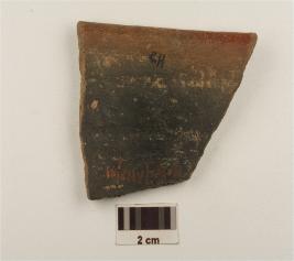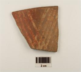 | Description / विवरण | A fragment of red ware having russet coated painted design with cross-hatched pattern, featureless rim and medium fabric. |