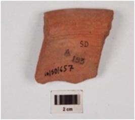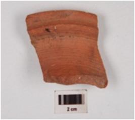| Description / विवरण | Fragment of a vase of red ware, treated with red slip on both sides, has flaring thickened with groove rim, concave neck and convex profile. |