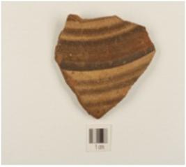 | Description / विवरण | Fragment of buff sliped ware, vessel painted with multiple horizontal lines and a block paintings in chocolate pigment. |