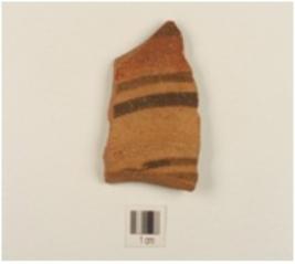 | Description / विवरण | Fragment of buff sliped ware vessel with a red sliped area on the exterior and painted with horizontal bands in black pigment. |