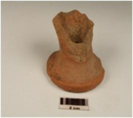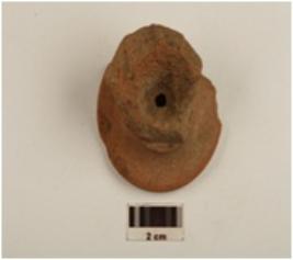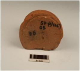 | Description / विवरण | Fragment of short pedestal base of a red ware vessel, concave body with disc base, a hole on interior, medium fabric and well baked. |
