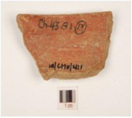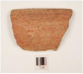 | Description / विवरण | Fragment of a vase of red ware with inverted rim, convex sides, medium fabric, well oxidized core and surface treated with red slip. |