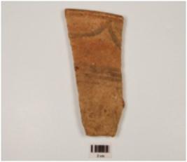 | Description / विवरण | A base fragment of dish-on -stand of buff ware treated with buff slip on top edge tapering profile painted with loops and horizontal lines in black pigment on the exterior. |