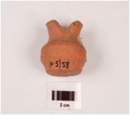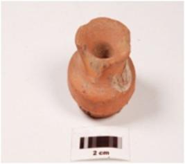 | Description / विवरण | A wheel made terracotta miniature pot, visible striation marks, traces of dull red wash, intact rim portion. |