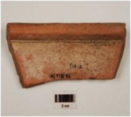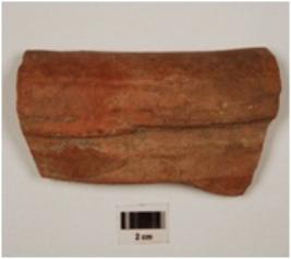 | Description / विवरण | Fragment of a basin of red ware with externally thickened incurved rim with grooves on exterior, thick section, medium fabric and well oxidized core. |