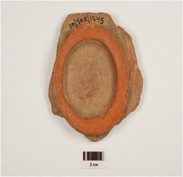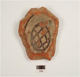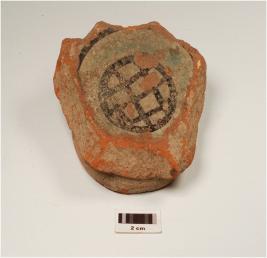 | Description / विवरण | A base fragment of dish of glaze ware, broken rim, ring base, circular band and cross design in centre picked up in black pigment against white background in the interior. |