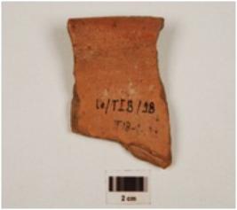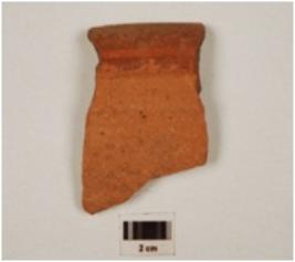 | Description / विवरण | A fragment of basin of red ware has collared rim with groove and receeding profile. |