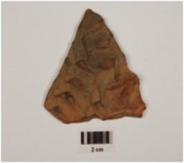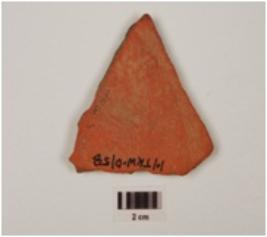| Description / विवरण | A fragment of red ware treated with red slip has rustication on the exterior. |