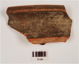 | Description / विवरण | A fragment of vase of red ware has out-turned rim, concave neck medium fabric and treated with chocolate brown slip on the exterior surface. |