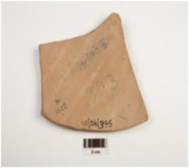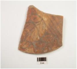 | Description / विवरण | A potshered of red ware treated with red slip and painted with intersecting circles making leaf filled with arches, diamonds and dots, also has four lines in black pigment on the exterior. |