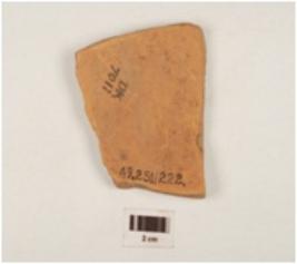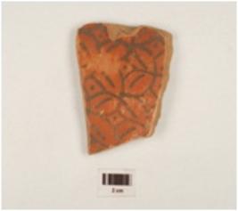 | Description / विवरण | Potsherd of dull red ware treated with red slip and depicting leaf twig motif in black pigments. |