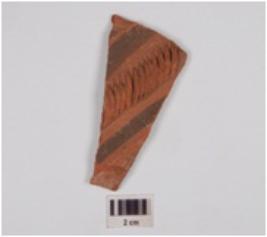 | Description / विवरण | A potsherd of red ware, painted with horizontal bands and applique design of medium fabric. |