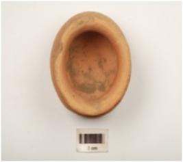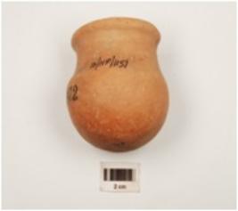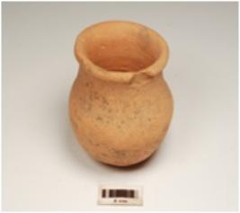 | Description / विवरण | A miniature vase of dull red war treated with dull red slip an the exterior out curved externally thickened rim, slightly damage globular profile and flat base. |