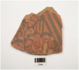 | Description / विवरण | A pot sherd of black on red ware vessel, horizontal bands with leaf motif in black pigment on surface, fine fabric red slip. |