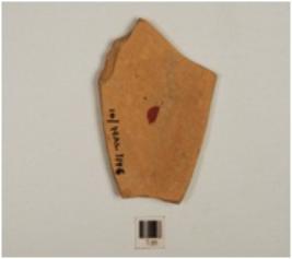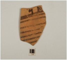 | Description / विवरण | Potsherd of buff ware bowl, step like design with faded horizontal lines below painted with chocolate brown pigment on exterior, convex profile, fine fabric and well baked. |