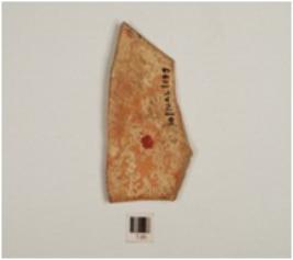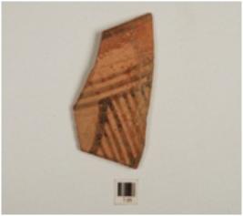 | Description / विवरण | Fragment of red ware straight sided bowl, featureless rim, faded slanting and horizontal bands painted with black pigment on exterior, medium fabric and well baked and traces of red slip. |