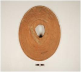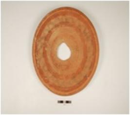 | Description / विवरण | Fragment of a black on red ware dish-on-stand, decorated with loops in black pigment, stamp missing, well baked and medium fabric. |