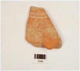 | Description / विवरण | Potsherd of a vessel of red ware with weak carination and stud handle on exterior, medium fabric and traces of red slip. |