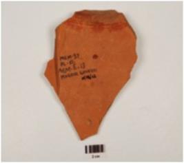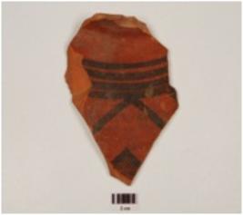 | Description / विवरण | Fragment of a vase of red ware, out-curved rim, receeding profile, painted with criss-cross pattern within daimond shaped design horizontal bands with oblique and slanting band in black pigment on exterior, fine fabric and red slip. |