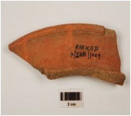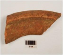 | Description / विवरण | Fragment of jar of red ware, treated with red slip on the exterior, has horizontally splayed out rm, depression inside and concave neck. |