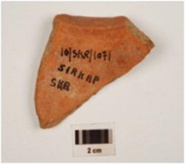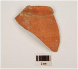 | Description / विवरण | A fragment of miniature vase of red ware, obliquelly splayed out rim, incised horizontal lines on profile and treated with red slip. |