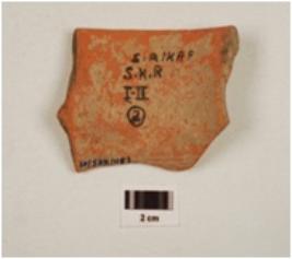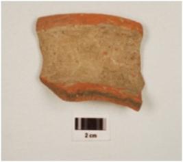 | Description / विवरण | Fragment of red ware vase externally thick rim, concavity below, smoky section, medium fabric and traces of red slip. |