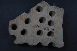 | Description / विवरण | It is a broken fragment of perforated jar made of terracotta was found in Banawali. It is well fired and color is red. There are some incised fine holes on its sarface. Its wheel made pottery. |