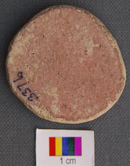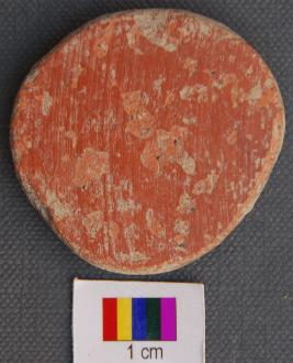 Description / विवरण | It is a beautiful terracotta disc, the edge of which is grind and it is slipped on one side. It may have been made out of a body sherd of red slipped ware as it has a thick slip, which is peeling off. It may have been used as a gamesman. |