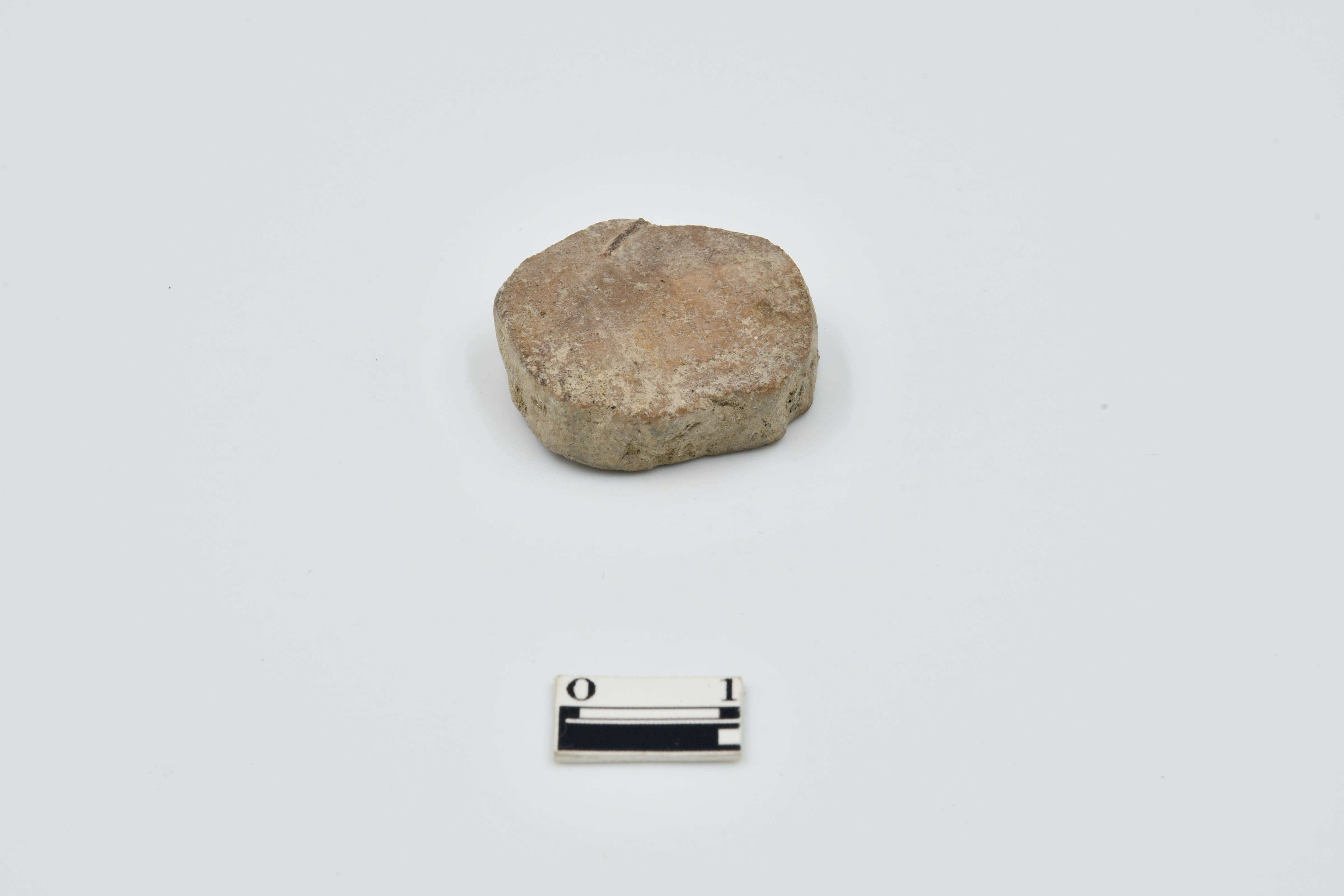 Red ware pottery disc with irregular edges. Rough surface chipped on edges