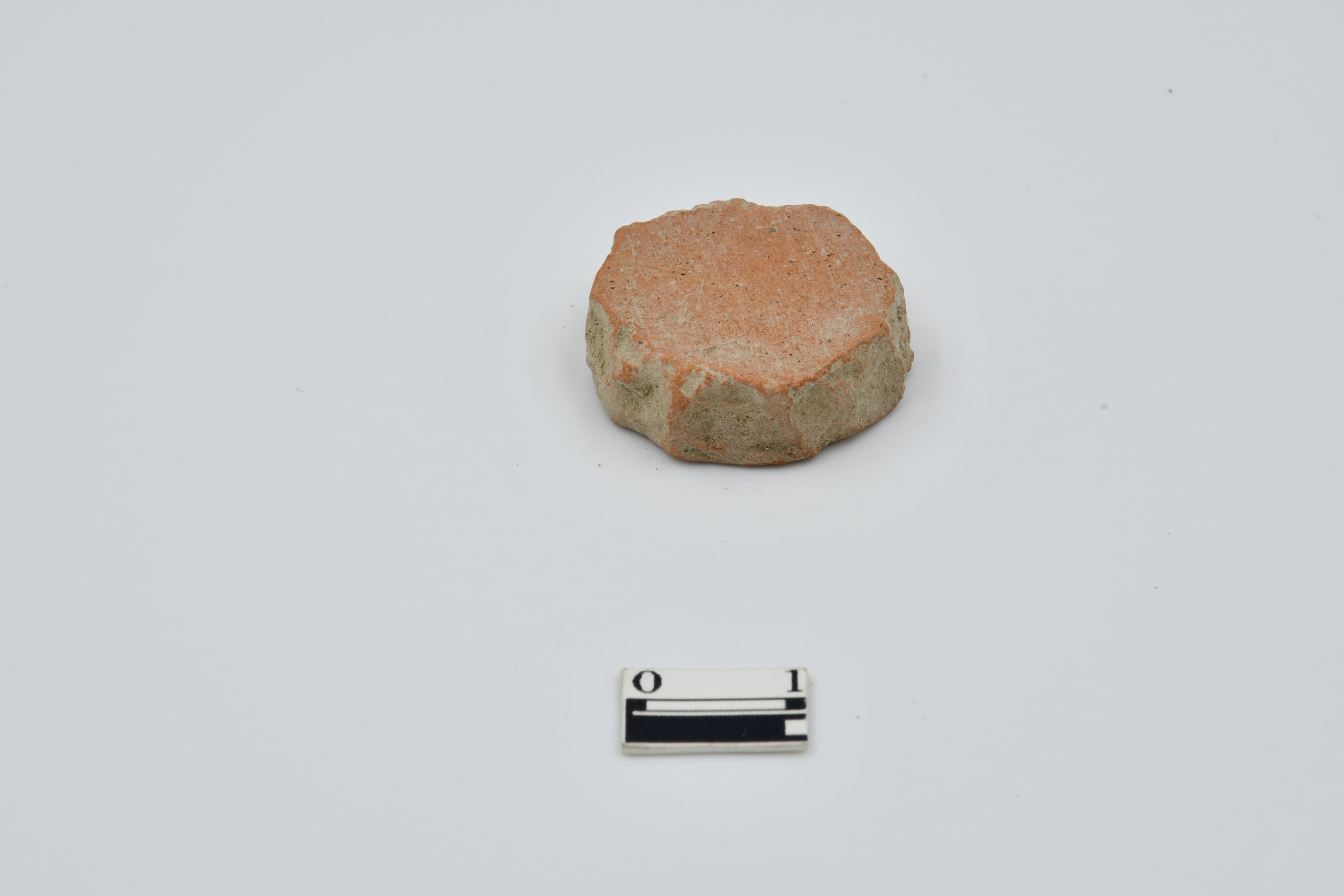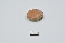 Red ware pottery disc. Irregular shape on edges.