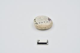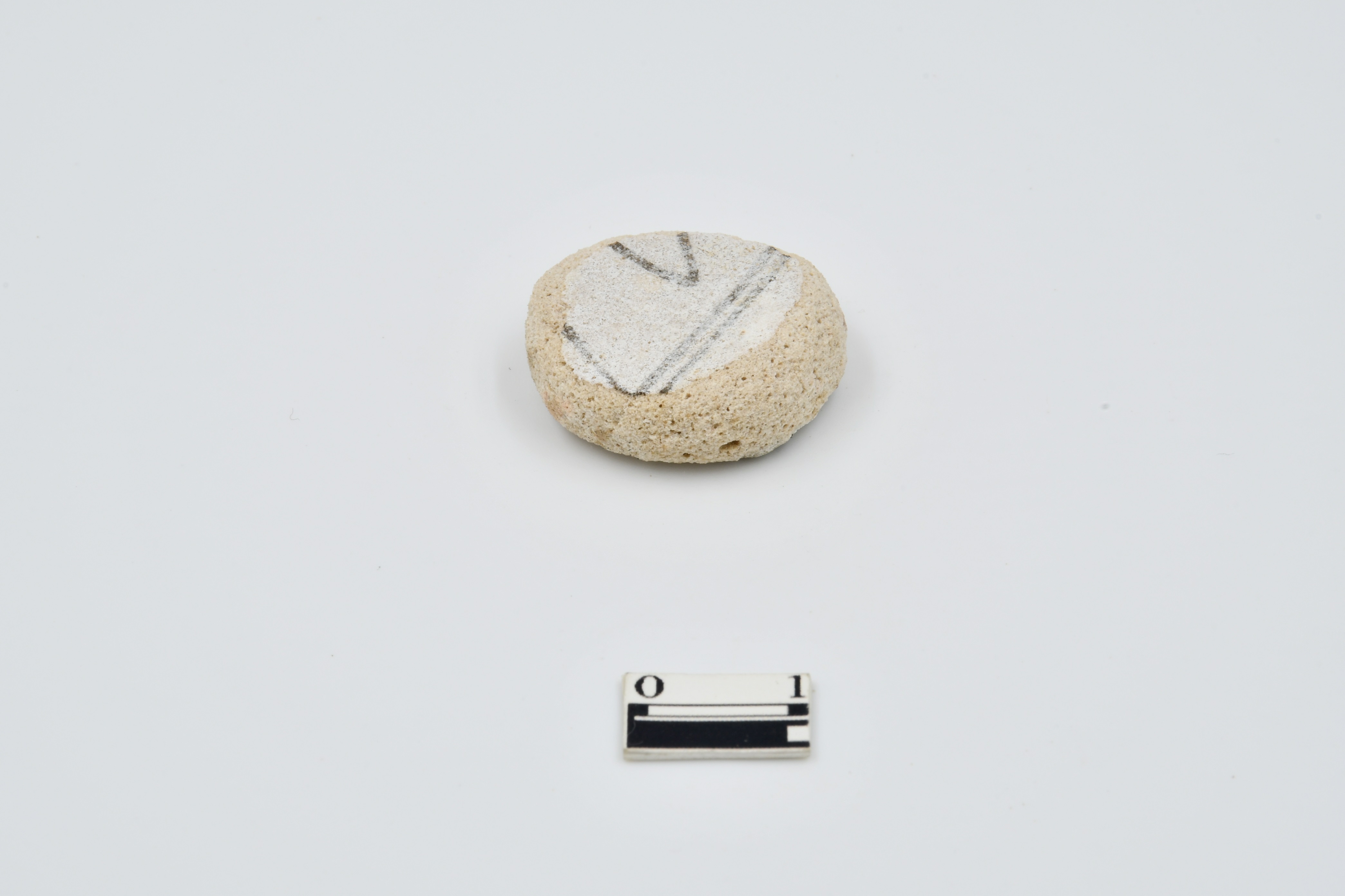 terracotta disc made of glazed ware pottery. black dotted pttern at right angle and other side parallel lines